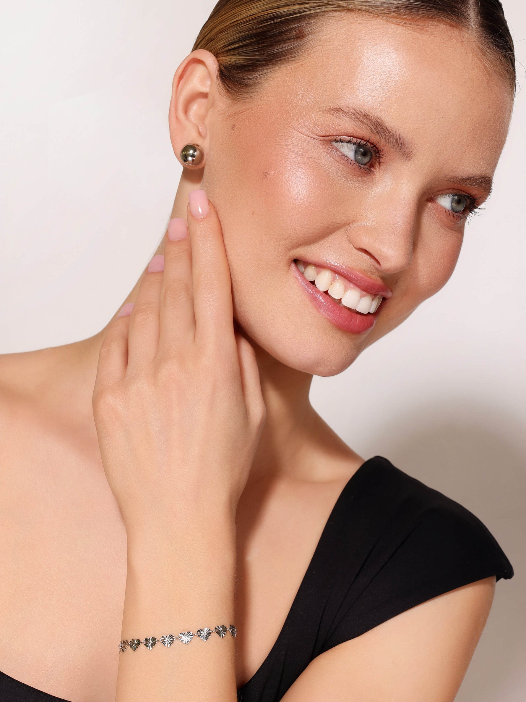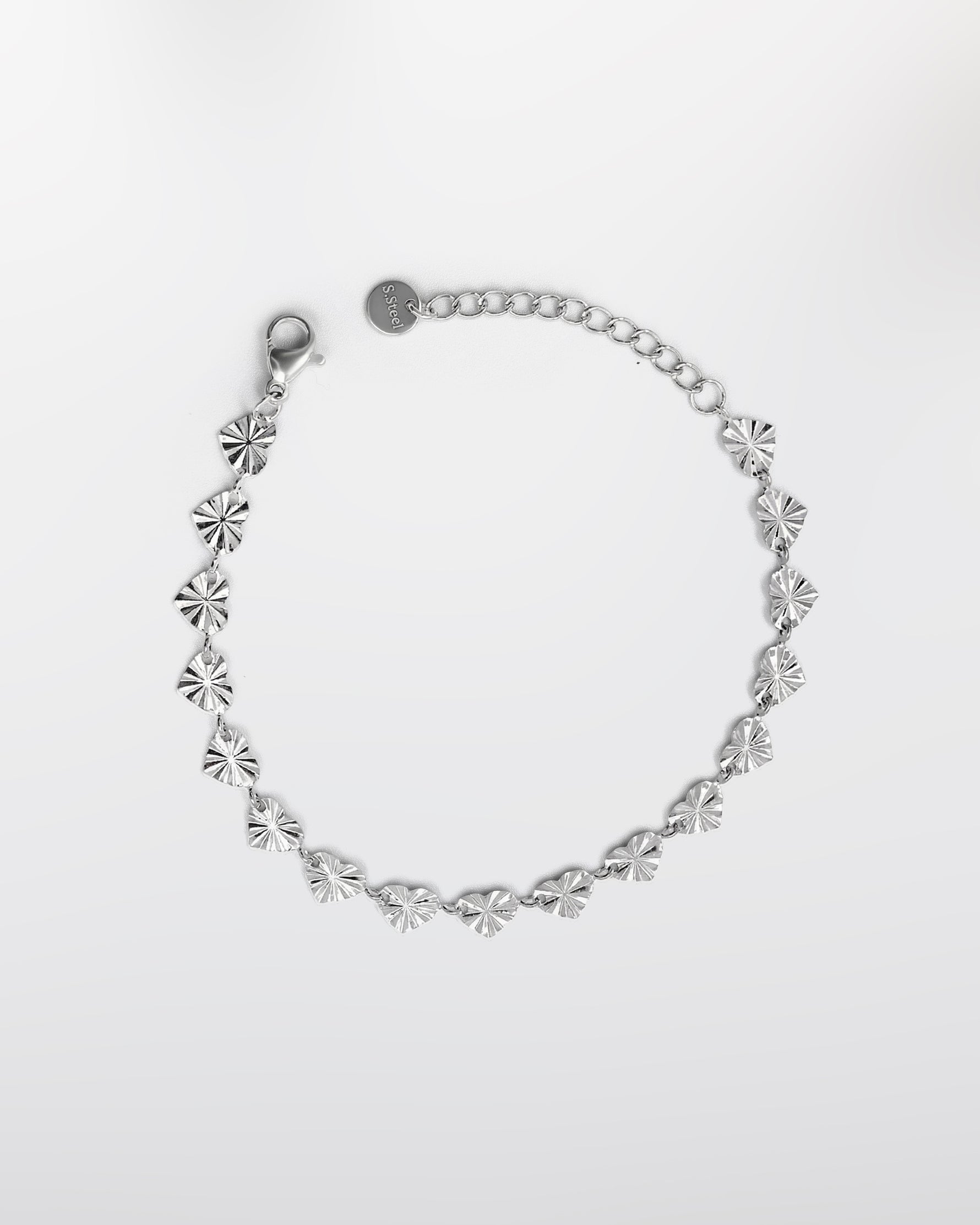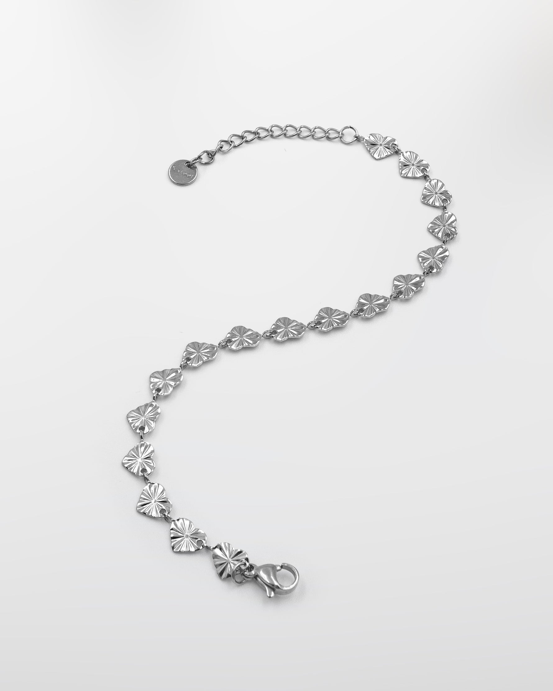 Bransoletka z serduszek ozdobionych subtelnymi, dekoracyjnymi liniami. Delikatny wzór nadaje całości rytm i wyjątkowy charakter, łącząc romantyczny motyw z nowoczesnym wykończeniem. Lekka forma, która zwraca uwagę detalem i dopracowaną strukturą. Wykonana ze stali chirurgicznej, pokryta 14k złotem i odporna na wodę.