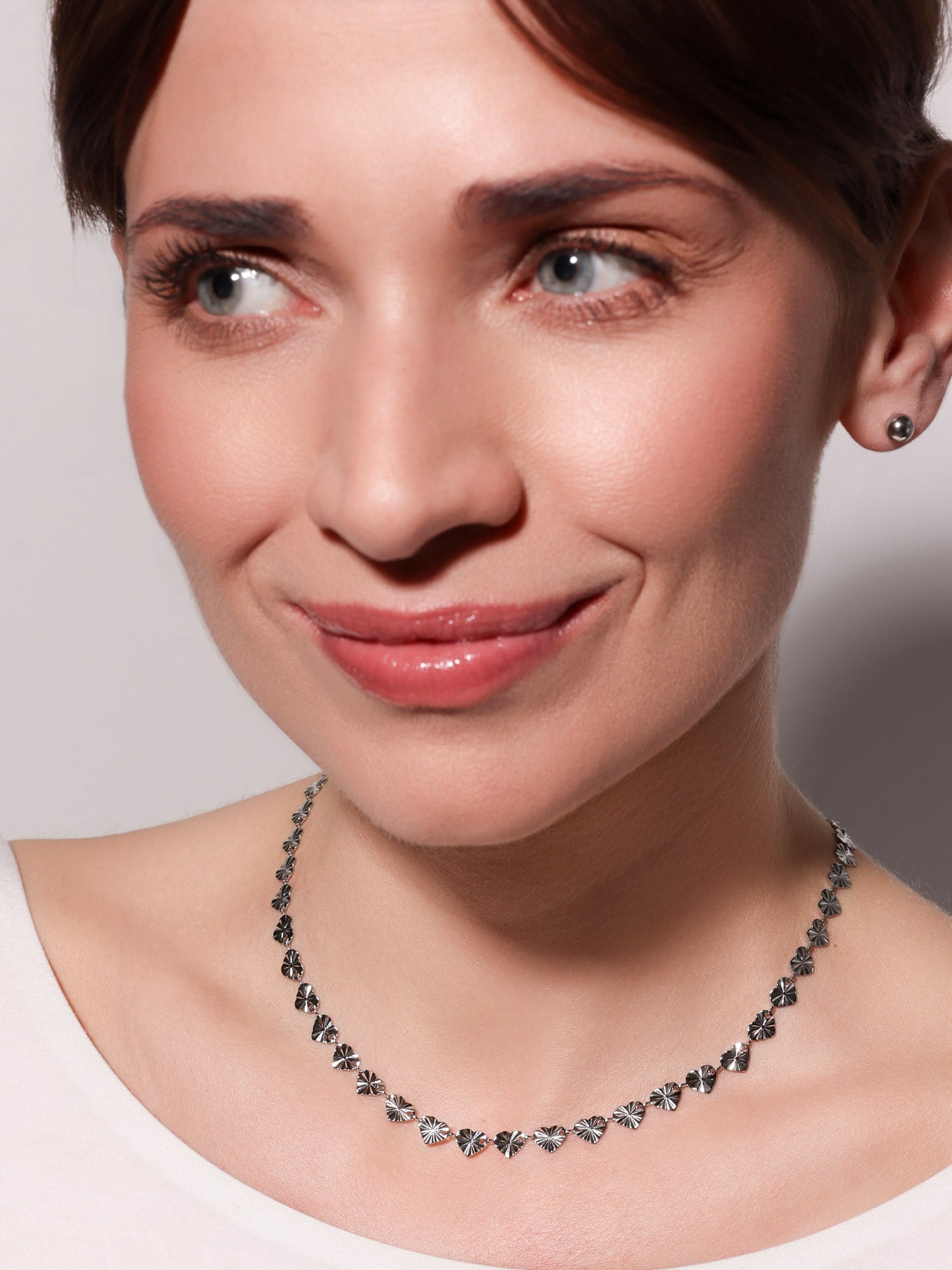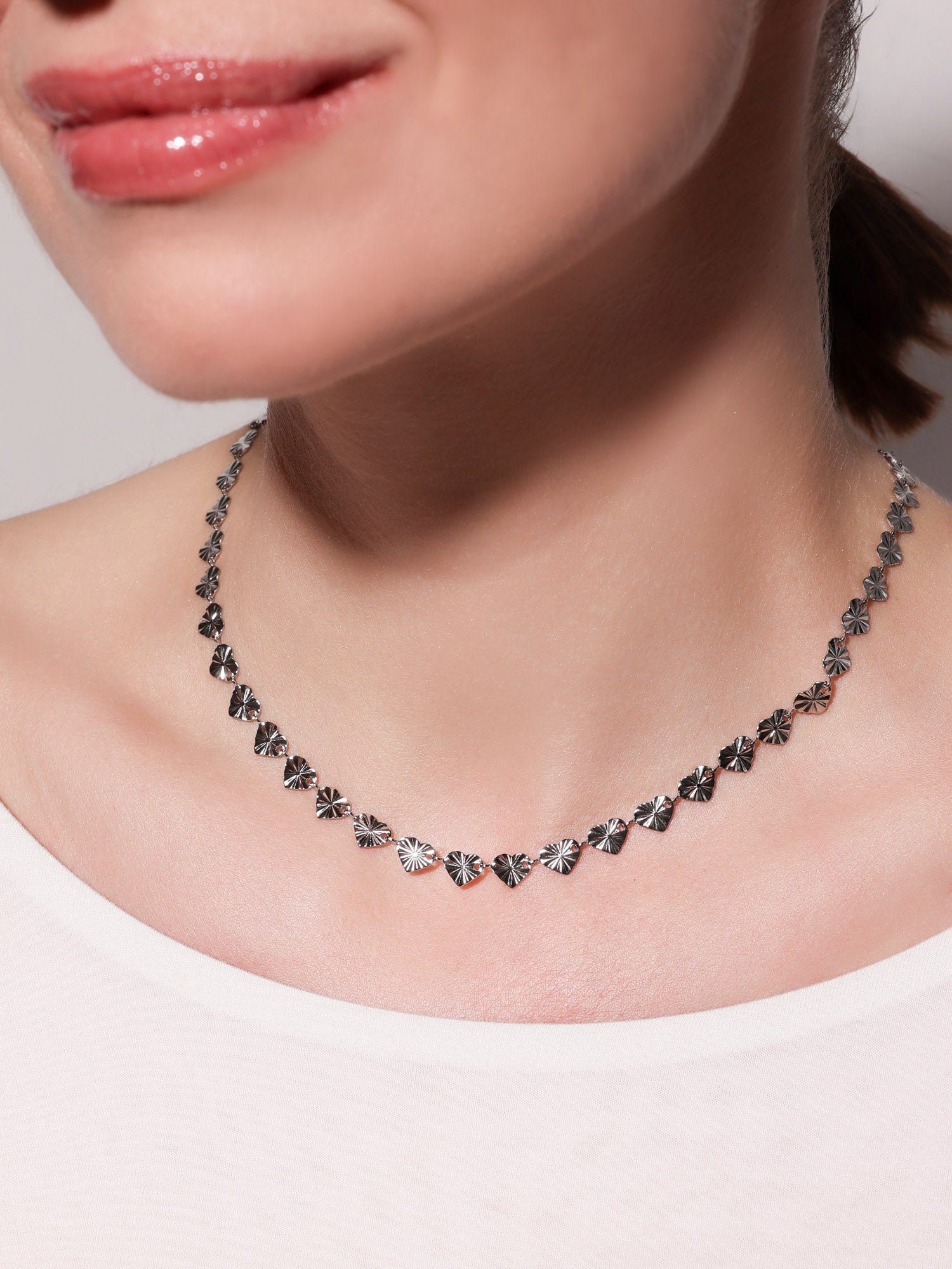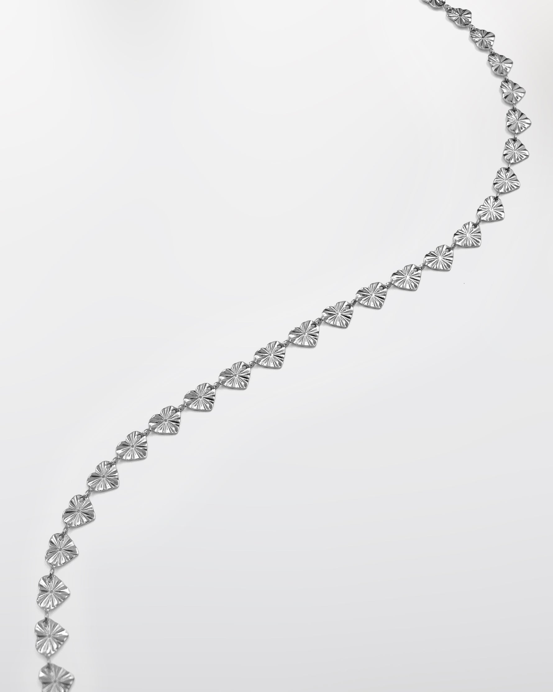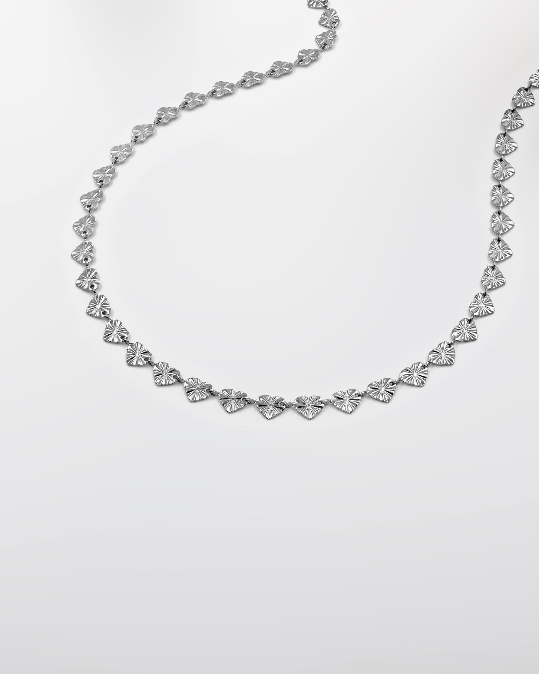 Naszyjnik wykonany z małych serduszek o regularnej, liniowej teksturze. Stworzony ze stali chirurgicznej, odporny na wodę i hipoalergiczny. Będzie towarzyszyć Ci codziennie z trwałością i subtelnym blaskiem.